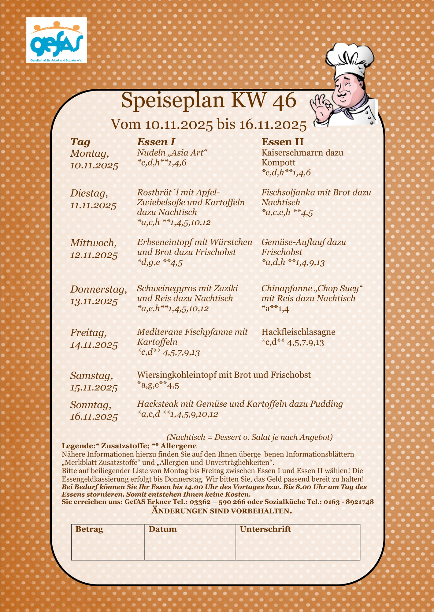 An Wochentagen stehen ihnen zwei Wahlessen und an Samstagen, Sonntagen, sowie Feiertagen ein Essen zur Verfügung.