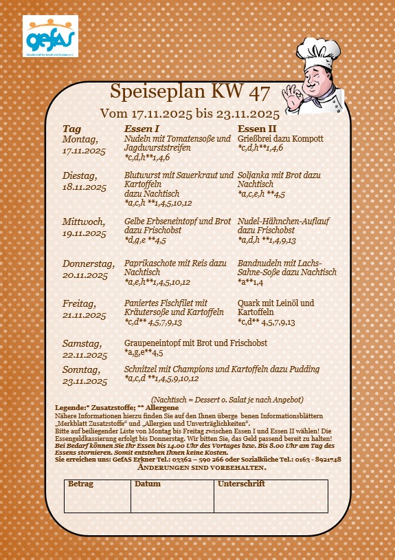 Tägliche mobile und stationäre Bereitstellung frisch gekochter und altersgerechter Speisen.